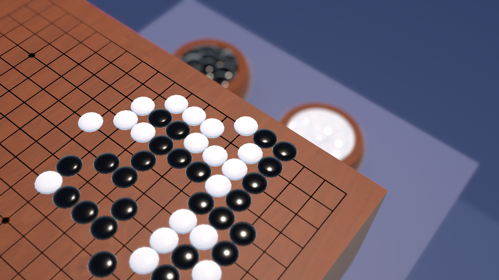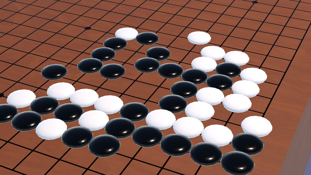 A working Go board for VRChat, featuring a 19x19 wooden Goban, stone bowls and stones.